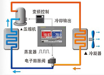 以加熱·冷卻輸出控制變頻器與調(diào)節(jié)電子膨脹閥,控制各區(qū)間的冷媒量 來調(diào)節(jié)被浪費(fèi)的加熱量及控制冷凍機(jī)來實(shí)現(xiàn)節(jié)能。(變頻控制為選項(xiàng)) |